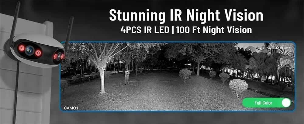 7. 4-dot matrix infrared light and 4-dot matrix white light light; infrared night vision 30 meters, white light full color 20 meters;